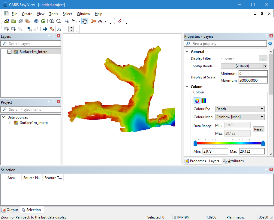 The selected surface is shown in the Display window, a display layer is added to the Layers window and an item is added under Data Sources in the Project window. The display layer represents the primary elevation layer of the data source, in this case, that is the Depth band of Surface1m_interp.