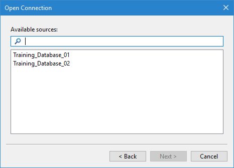 Available sources | All data sources, such as databases, found on the server that was selected in the previous step. 1. Select a source from the list. |