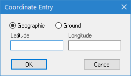 This command uses the same dialog box as the Centre on Coordinate and Use Coordinate commands. Once coordinates are entered for one of these commands, they are saved to the Lat and Lon fields in the toolbar and can be used for any of the three commands. The fields in the toolbar must be used if the coordinates need to be changed for subsequent tasks. Completely removing the coordinates from these fields allows the dialog box to again be launched from the commands.