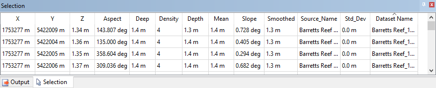 The Selection window displays all band values for the selected points, including the newly computed slope and aspect values.