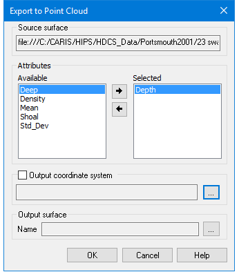 Attributes | The Attributes lists are used to select the attribute bands to be included in the resulting point cloud. The Available list contains all attributes present in the source surface. The Selected list contains all attributes selected for inclusion in the export. To select attribute bands for the export: 1. Select an attribute in the Available list. 2. Click the right-arrow button. To remove an attribute: 1. Select the attribute in the Selected list. 2. Click the left-arrow button. The primary Z layer is mandatory and cannot be removed from the Selected list. |