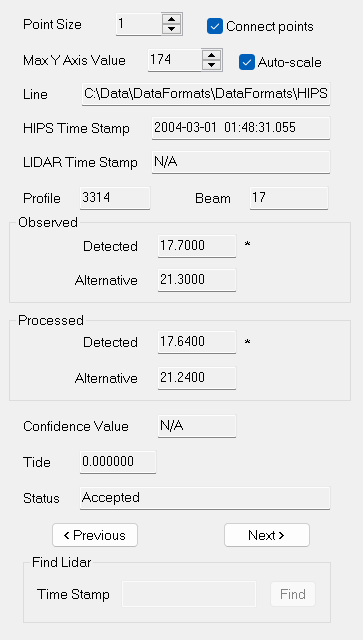 The Lidar node provides properties for working with Lidar data in the Subset Editor. In order to populate the properties in this node, points must be selected in either the 2D View or 3D View window. The properties are populated for a single point at a time; the Previous and Next buttons can be used to view other points in the selection. All properties provided here are read-only, meant for information purposes only.