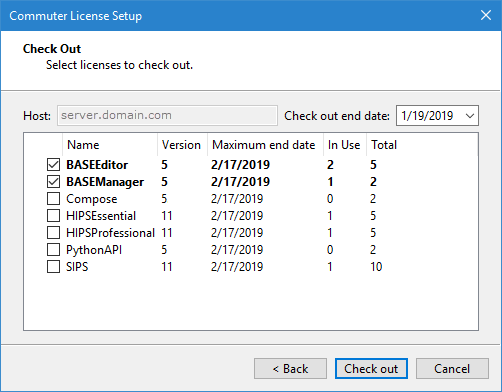 The Check Out step is displayed. This step is used to select the modules licenses you want to check out and the end date for the commuter license.