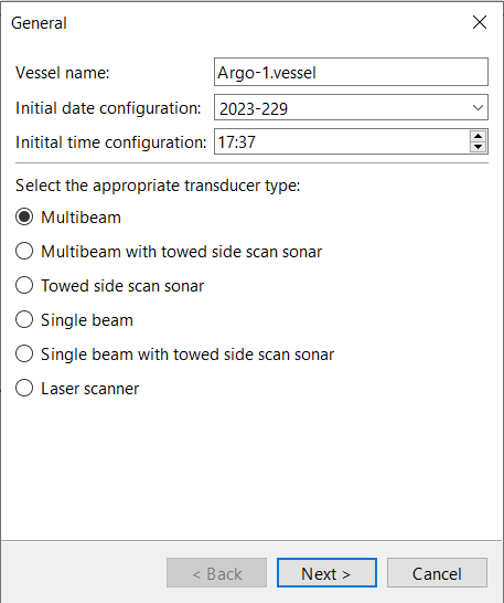 For Towed Side Scan Sonar, there are no further screens, so the Next button is replaced by Finish. Click Finish to create the vessel file then select the Save command to save it.