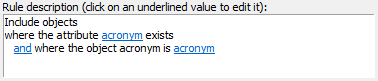Certain terms in the conditions are hyperlinks. You use these links to define the specific acronym, feature type, or value that you want to match, or to change the conditional operator from “and” to “or”.