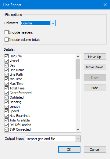 The saved report will contain a table of values under the same column headings that can be viewed in the Detailed Line Query window.