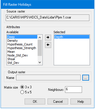 The original coverage is not affected by this command. A copy of the selected coverage is created and the interpolation is performed on that data. The new surface will be in the format of the input data. For example, if the source coverage is a raster surface, the output coverage will also be a raster surface. If the input were a point cloud, the output would be a point cloud. The new coverage will contain a copy of each attribute band that was selected for inclusion in the output as well as a Holidays band and an Interpolated band. The Holidays and Interpolated bands will contain the data classifications and the interpolated nodes. The names of these bands will differ depending on the name of the primary elevation band in the source coverage. For example, if the primary elevation band were called Depth, the interpolated coverage would contain a Depth and Holidays band and a Depth Interpolated band.
