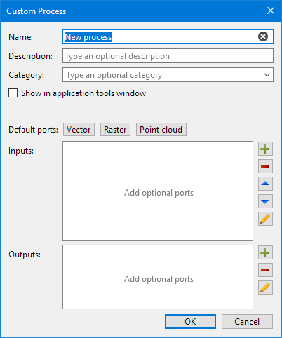 Default ports | Automatically create ports for the process using defaults defined for each of the data formats, rather than defining the ports manually. Clicking the button for one of the formats will add ports in both the Inputs and Outputs lists. These ports can be adjusted or removed as needed once added to the lists. | |