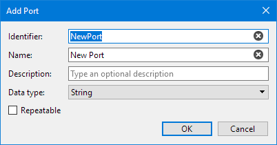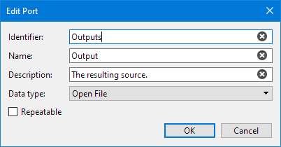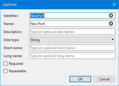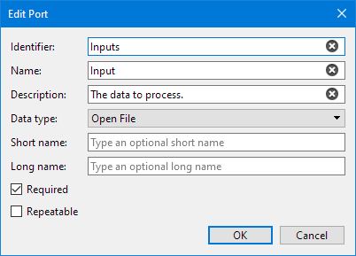 The following settings are available for the port: • Identifier: The identifier that will be used for the port in the python code. • Name: The name that will be displayed for the port when the process is added to the Model View of Process Designer or when the process is populated in the Run Process Model dialog box of a Teledyne Geospatial application. • Description: A textual description of the function of the port. • Data type: The type of data that can be added to the port. • Repeatable: Define whether the port can have multiple items specified. When enabled, the property for the port will be in a list format. 2. Define the port settings as needed. 3. Click OK. The port is added to the list, displayed with the Name setting specified. | |