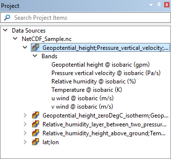 Each of the source layers contains data from multiple bands. These bands can be viewed in the Project window and added ot the Layers window using the Add Layer command.
