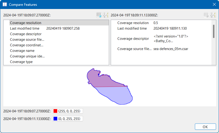 The information displayed in the dialog box will depend on the journal entry that was selected from the History window, different types of changes provide different details. The panes in the top half of the dialog box provide a list of the attributes that were changed and their state in each version, either current or previous. The bottom pane provides a visual comparison of the differences in the geometry of the object.