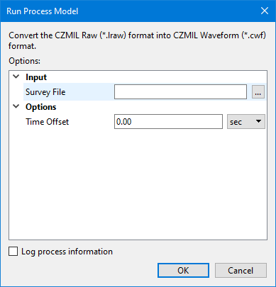 The Convert CZMIL Raw process model is used to create CZMIL Waveform (.cwf) data from raw CZMIL lidar data. During this process, the application reads the survey file to identify the input .lraw files and assign file name to the resulting .cwf files.