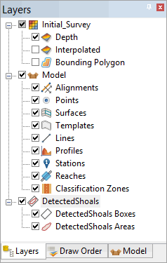 The shoals are detected and saved. Layers are added to the Layers window for each of the shoal feature types.