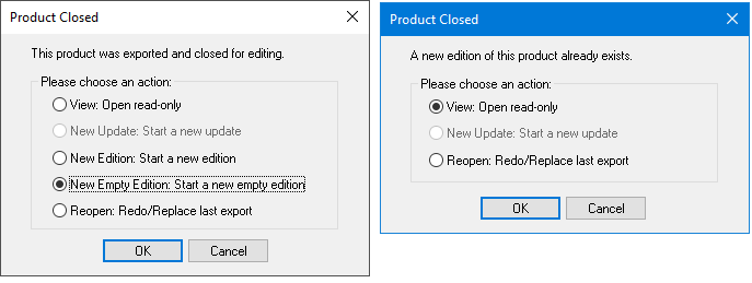New Edition | Open the exported product as a new empty edition. The edition number is incremented by one and the issue date is set to the current date. |