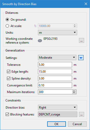 Direction bias | The direction bias of smoothing for contours that do not have a defined contour slope attribute. For contours generated in CARIS applications, Right is usually the safe direction. It is, however, best to confirm that against the source dataset for which the contours were generated. Deep isolations and contours generated outside CARIS may have a reversed contour direction, which could require that Left be used to preserve safety. The Ignore option can be used to apply smoothing only to contours that have defined slope attributes. This option is only displayed if some of the selected contours do not have a defined contour slope attribute value. |