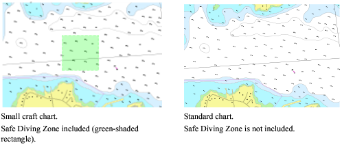 A Paper Chart profile might include features relevant only to small craft charts. One feature is the Safe Diving Zone area. This feature informs small-craft chart users of areas that are safe for recreational scuba diving1.