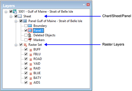 Raster charting combines a database chart in PCE with a set of high-resolution monochrome TIFF or RLE images. These files are opened as layers with each layer representing a single colour (similar to traditional film separates). Raster layers are grouped in a raster set.