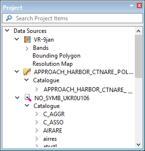 Data sources are listed in the Project window, with their features, bands or attribute items displayed below each data source name. For example, Catalogue items can be expanded to see object names. A CARIS file could list each feature type (polygons, lines, names, soundings, and symbols). CSAR files have bands such as intensity, depth, weight values etc.