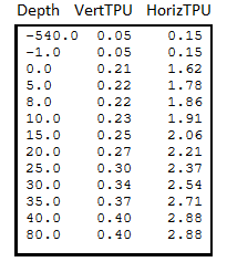The data is displayed in three columns: Depth, VertTPU and HorizTPU. Depth units are expected to be in metres, and the TPU values are treated as confidence intervals.