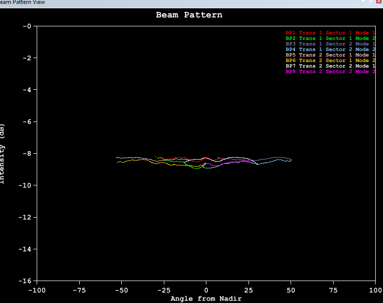 The Beam Pattern View displays the beam pattern graph. If the sonar system used multiple modes or independently-steered sectors, then each combination of mode and sector will have its own line in the graph. The colours of these lines can be adjusted in the Tools > Options menu, under Display > Beam Pattern.
