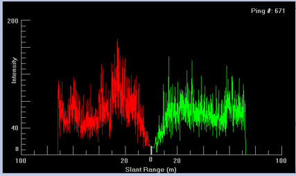 The Signal Display window is refreshed to show the sonar signal intensities for the first ping in the selected range. (The ping closest to the bottom of the Side Scan View.)