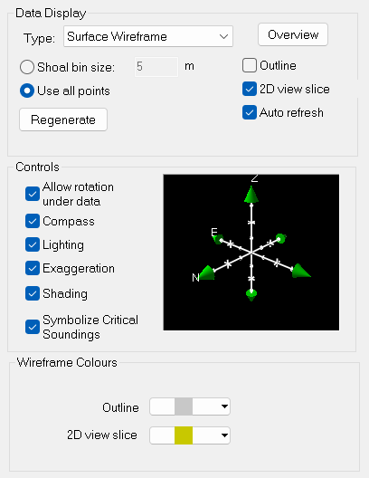Data Display | Type | Select the display type from the list to set options for the type. • Points - soundings shown as unconnected points. • Spheres - soundings shown as unconnected spheres. • Cylinders - soundings are shown as cylinders. If the soundings contain horizontal and vertical uncertainty values, then the cylinders are sized according to those values. • For example, soundings on the outer edge of a swath have a larger radius than soundings on the inner edge because of the greater horizontal uncertainty. • Soundings without TPU values are drawn to a set size. • Surface - shown as a smooth surface. • Surface Wireframe - soundings are shown as a Triangulated Irregular Network (TIN) that connects soundings. |