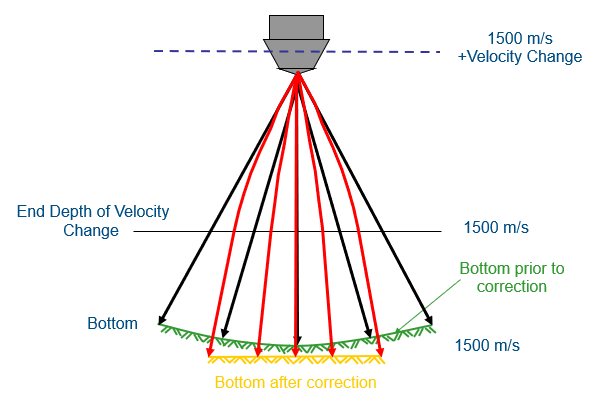 For correction purposes, a constant sound velocity (SV) is assumed. This constant is assumed to be 1500m/s and matching travel-times are calculated to represent the same bottom that the sound velocity profile (SVP) represented. The Sound velocity offset Depth is the depth at which the velocity will be 1500m/s again. The sound velocity correction is the amount the velocity will change between the water surface and the given depth.