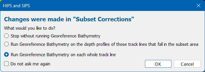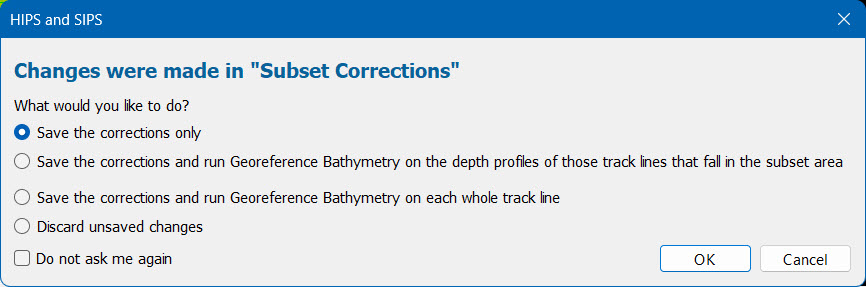 The Do not ask me again check box can be used to stop the dialog box from displaying each time and automatically use the last used option instead. The Subset Correction Save option in Tools > Options > Display > Notification can be used to change the default function, if needed.
