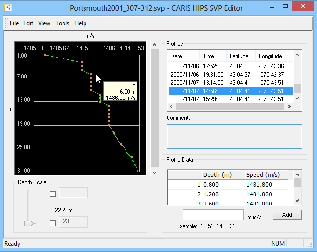 SVP Editor is a separate program that is launched from HIPS and SIPS that can be used to edit an existing SVP file before it is loaded and applied during sound velocity correction.
