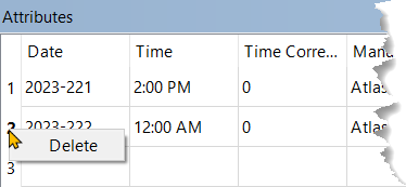2. In the Attributes window, right-click on the row number of the attributes that you want to delete.