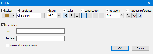 • change the formatting of the text feature as a whole (colour, typeface, size, style, justification, and rotation)