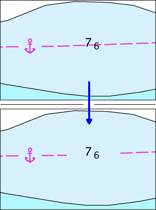 Masking hides segments of features or entire features to improve chart readability. For example, a line segment overlaps a sounding so that the sounding is obscured. Masking hides that part of the line that passes behind the sounding. See below.