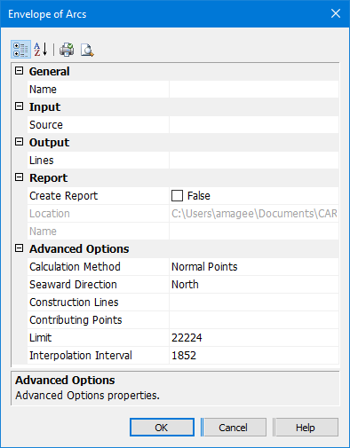 Create Report | Output points to a text file: • False: No report file will be created. • True: Generate a report. The report lists the start and end points of each arc along with the contributing points. The Location and Name properties become active. |